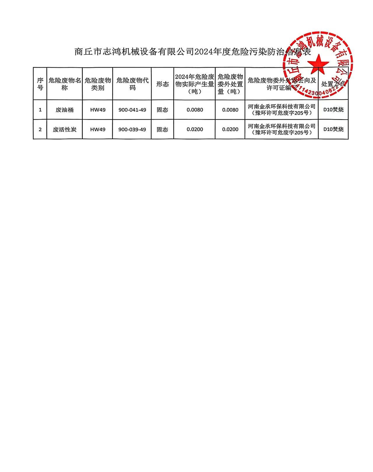 商丘市志鴻機(jī)械設(shè)備有限公司2024年度危險(xiǎn)污染防治信息表 <了解詳情>